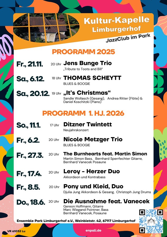 Wir sind offen für die große stilistische Bandbreite des Jazz und bieten gerne herausragenden Talenten der Region ein Forum, ebenso deutschen Gruppen, wie auch international noch nicht so bekannten Formationen, die originelle Musik bieten.